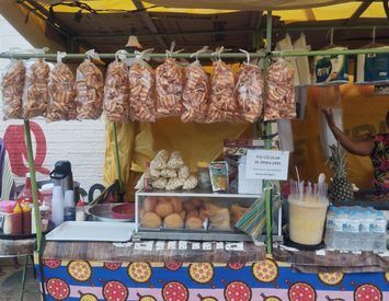 Na barraca, o casal vende uma variedade de comidas e bebidas, como carne na chapa, cachorro-quente, pipoca, refrigerante, batata-frita, entre outras mercadorias.