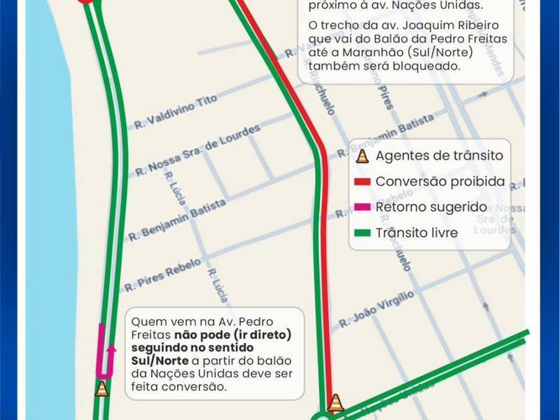 Já os motoristas que circulam pela Avenida Pedro Freitas não poderão seguir em linha reta no sentido Sul/Norte. O deslocamento deve ser realizado a partir do balão da Nações Unidas, onde será necessário efetuar a conversão.