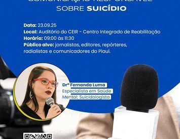 A Secretaria de Estado da Saúde do Piauí (Sesapi), por meio da Diretoria de Atenção à Saúde Mental e da Gerência de Prevenção do Suicídio, realizará no dia 23 de setembro, das 9h às 11h30, o evento “Café com a Mídia: Comunicação Responsável sobre o Suicídio”, no auditório do CEIR. A roda de conversa será conduzida pela suicidologista Fernanda Luma.