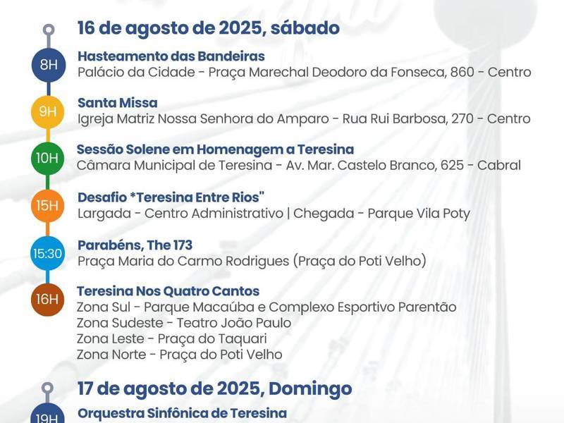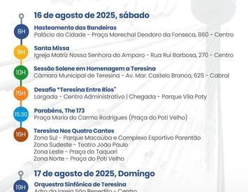 Em alusão à data, a Prefeitura de Teresina divulga as atividades que acontecerão nos dias 16 e 17 de agosto. Dentro das celebrações religiosas e culturais, o evento contará com o tradicional hasteamento das bandeiras, missa em ação de graças, sessão solene na Câmara Municipal e o tradicional corte do bolo.