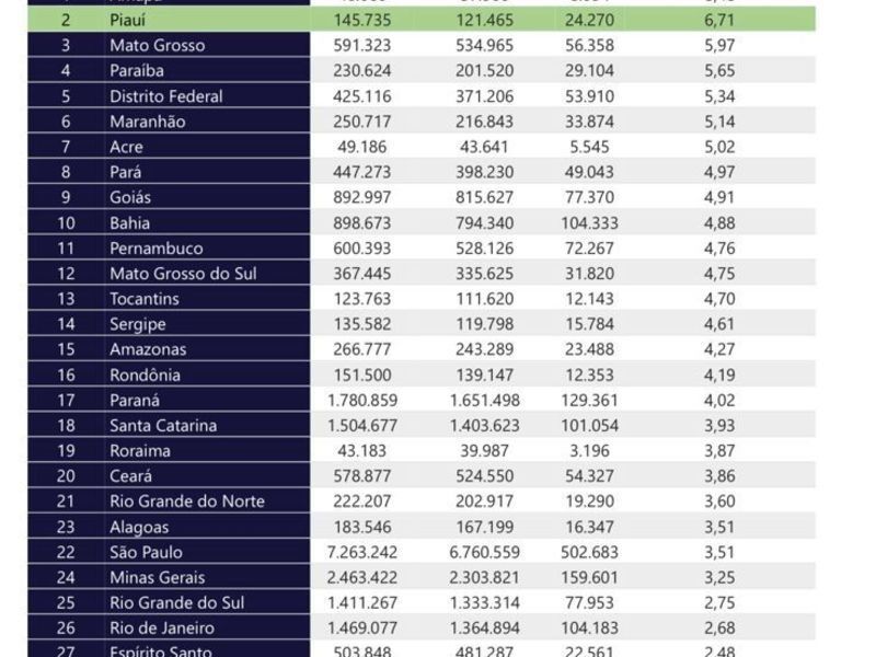 Os dados mais recentes do Cadastro Geral de Empregados e Desempregados (Caged) divulgados nesta quinta-feira (27), mostram que o Piauí segue em ritmo acelerado de geração de empregos. De janeiro a outubro, o estado criou 24.270 vagas formais, um avanço de 6,71%, desempenho que coloca o Piauí na liderança do Nordeste e na segunda posição entre os estados brasileiros em crescimento do emprego formal em 2025.