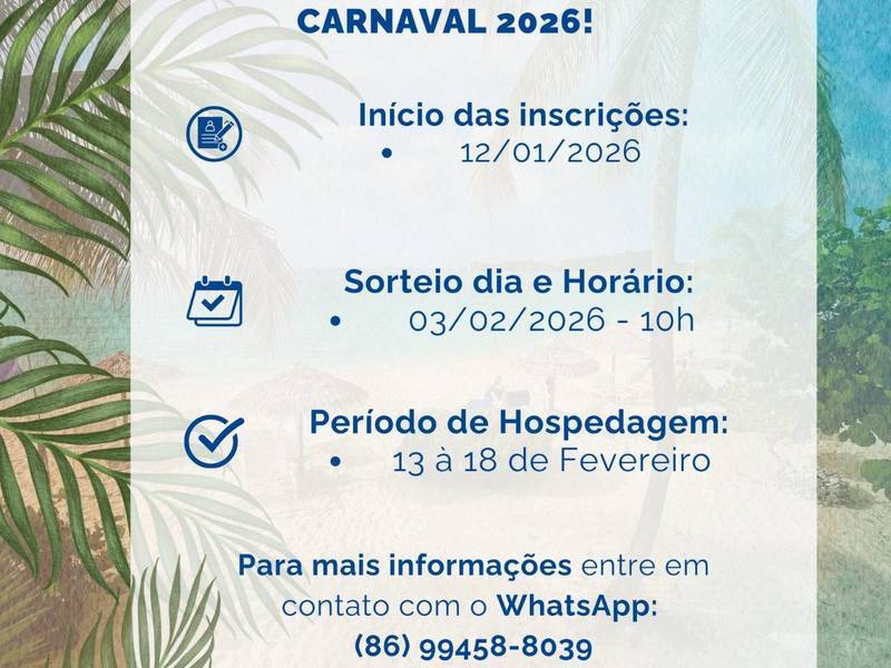 Quem deseja aproveitar o Carnaval no litoral piauiense com conforto, tranquilidade e economia já pode se programar. A Prefeitura de Teresina, por meio do Instituto de Previdência dos Servidores Municipais de Teresina (IPMT), abre inscrições para hospedagem no IPMT Praia durante o período carnavalesco de 2026.