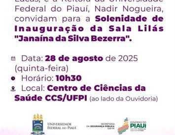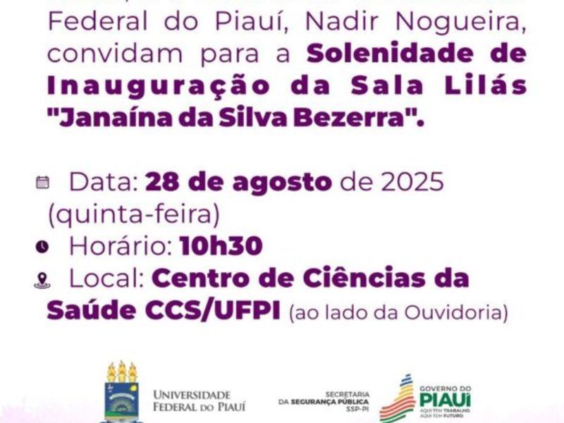 Com o objetivo de enfrentar qualquer forma de violência contra a mulher e oferecer acolhimento no ambiente acadêmico, a Secretaria da Segurança Pública do Piauí (SSP-PI), em parceria com a Universidade Federal do Piauí (UFPI), inaugura a Sala Lilás Janaína da Silva Bezerra. A solenidade será realizada nesta quinta-feira (28), às 10h30, no Centro de Ciências da Saúde (CCS), localizado no Campus Ministro Petrônio Portella, bairro Ininga, zona Leste de Teresina.