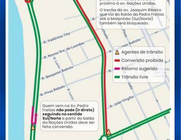 Já os motoristas que circulam pela Avenida Pedro Freitas não poderão seguir em linha reta no sentido Sul/Norte. O deslocamento deve ser realizado a partir do balão da Nações Unidas, onde será necessário efetuar a conversão.