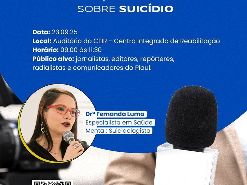 A Secretaria de Estado da Saúde do Piauí (Sesapi), por meio da Diretoria de Atenção à Saúde Mental e da Gerência de Prevenção do Suicídio, realizará no dia 23 de setembro, das 9h às 11h30, o evento “Café com a Mídia: Comunicação Responsável sobre o Suicídio”, no auditório do CEIR. A roda de conversa será conduzida pela suicidologista Fernanda Luma.