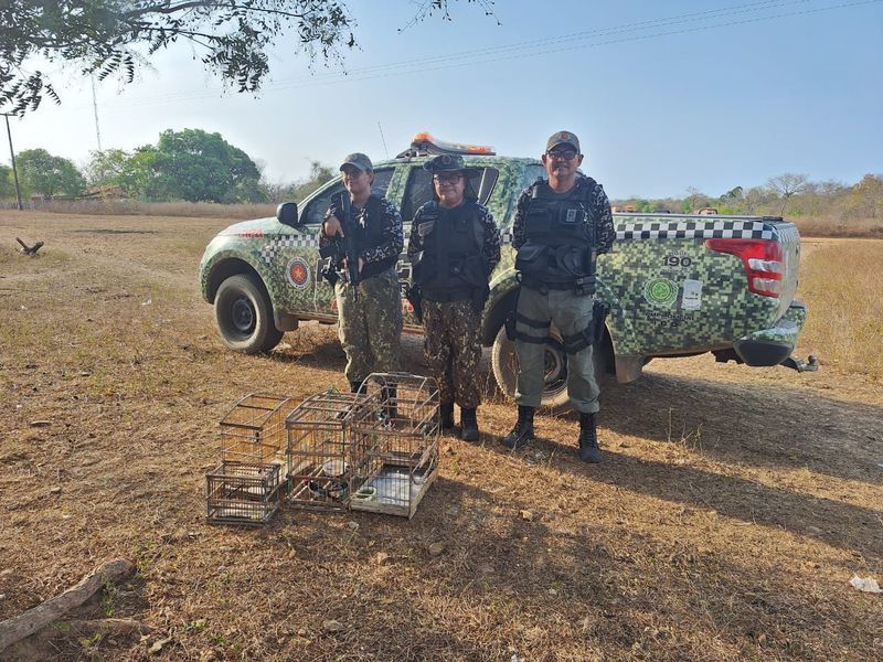 De acordo com o relatório, a equipe recebeu denúncia via celular funcional e se deslocou até o povoado, onde constatou a veracidade da informação. Na residência de um homem identificado pelas iniciais J.C.P.N. foram encontrados quatro pássaros da fauna silvestre, sendo três galos capina e um bigode pardo. Já em outro imóvel, pertencente a R.N.G., foi localizado um macaco-prego.